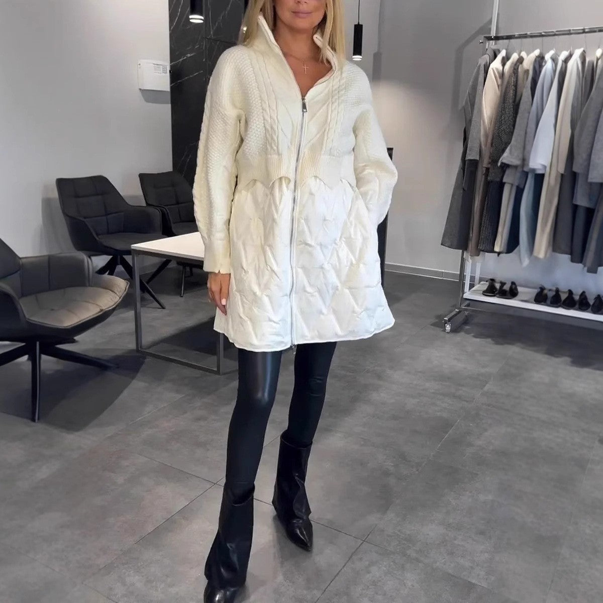 The Ameryl Mid-Length Padded Jacket is tailored for cozy sophistication. Designed in a loose silhouette with soft polyester and insulated with cotton padding, this jacket delivers warmth without compromising on style. Its clean aesthetic and mid-length cut make it a staple for casual elegance in cooler seasons.