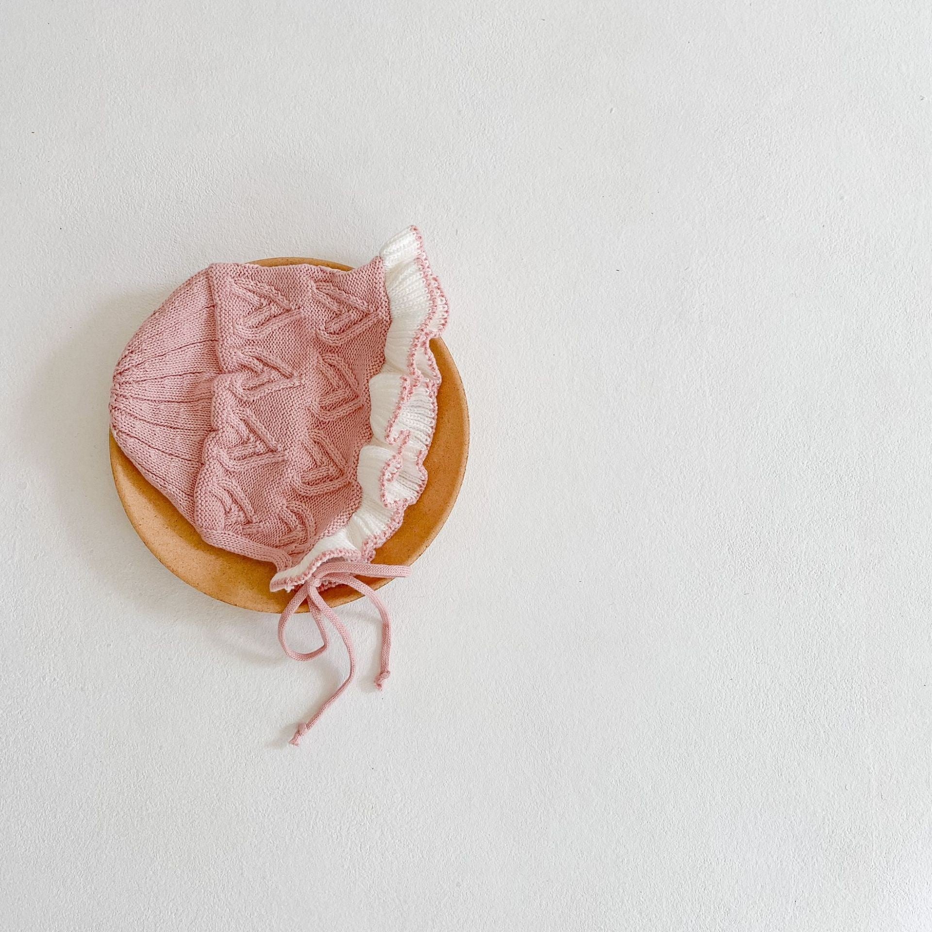 Details: - Material: Wool knit - Colors: Pink, Beige - Size: Free size - Crown: Dome - Brim: Ruffled design